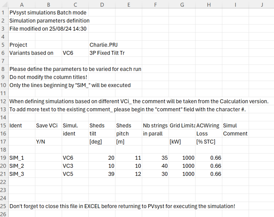 Hello, It seems like the Batch mode does not work correctly since the latest PVsyst update (7.2.16). After filling the parameter file with all the data needed and starting the simulation (first picture), PVSyst won't calculate every simulation as it did until then but will stay on an "initialization" state (as displayed on the window) a couple of minutes and end the calculation just after (second picture). When you open the results file, almost every simulation has an error message refering to an oversized inverter (third picture). These errors don't make sense as running a classic simulation with the exact same parameters (including in the settings of the batch mode in PVshows no problem of any kind (fourth picture). Also, even with an obviously smal number of MPPTs for a simulation, the batch mode stil considers it as oversized (it happened when I filled the cell with 3 instead of 10 for the SIM_3 for instance). This problem has been occuring only since the latest update as the previous batches I ran had no issues. My intuition is that PVsyst now understands the number in the "Inverter or MPPT" cell as a number of inverters and no more as a number of MPPT as it was before. How would it be possible to solve this problem ? Thanks in advance PVsyst team and members
